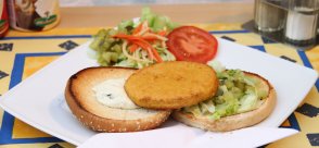Getoost broodje met sla, augurk, 100% grams kip burger en een saus naar keuze.