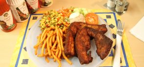 Broodje cheeseburger en patat. Zonder groente, inclusief slaatje, 1 saus naar keuze en een lekker toetje.