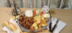 Patatje met saus, 4 nuggets of vingers, drankje, ijsje, snoepje en speeltje.