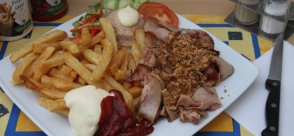 Lekkere eigengemaakte patat met warm vlees. Inclusief slaatje.