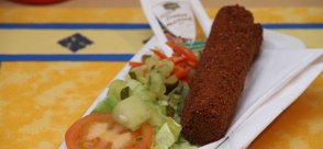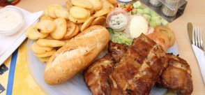 ±750 grams spareribs, patat, slaatje, stokbrood/kruidenboter, saus naar keuze en een lekker toetje.