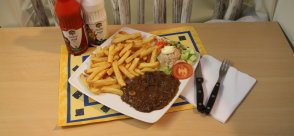 3 stokjes haassaté, stokbrood/kruidenboter en patat. Zonder groente, inclusief slaatje, 1 saus naar keuze en een lekker toetje.